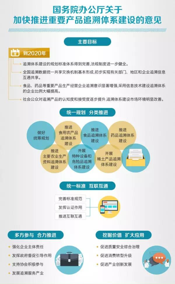 追溯體系建設是采集記錄產品生產、流通、消費等環節信息,實現來源可查、去向可追、責任可究,強化全過程質量安全管理與風險控制的有效措施。近年來,各地區和有關部門圍繞食用農產品、食品、藥品、稀土產品等重要產品,積極推動應用物聯網、云計算等現代信息技術建設追溯體系,在提升企業質量管理能力、促進監管方式創新、保障消費安全等方面取得了積極成效。但是,也存在統籌規劃滯后、制度標準不健全、推進機制不完善等問題。為加快應用現代信息技術建設重要產品追溯體系,經國務院同意,現提出以下意見:
