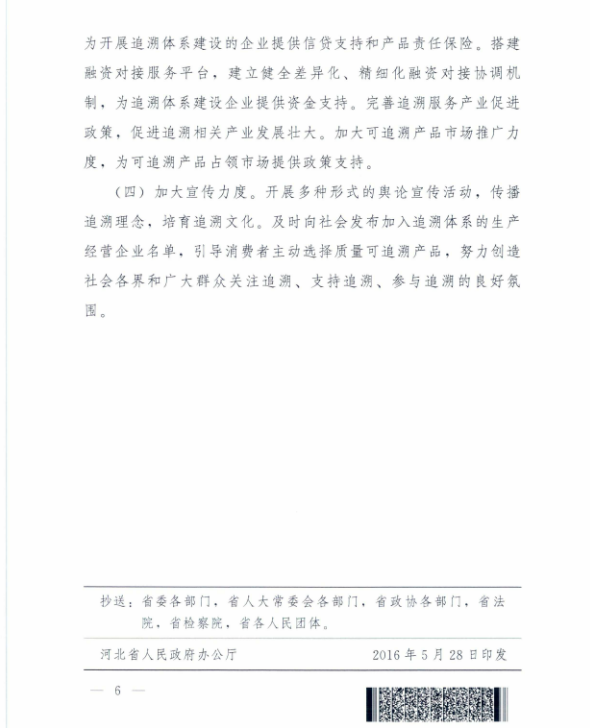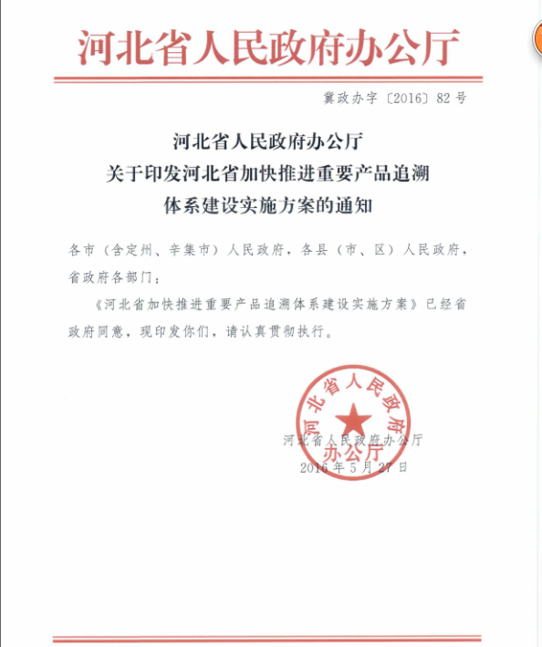 現(xiàn)將《河北省人民政府辦公廳關(guān)于印發(fā)河北省加快推進(jìn)重要產(chǎn)品追溯體系建設(shè)實(shí)施方案的通知》(冀政辦字〔2016〕82號(hào))(以下簡稱《實(shí)施方案》)轉(zhuǎn)發(fā)給你們,并提出如下要求,請(qǐng)一并貫徹執(zhí)行。